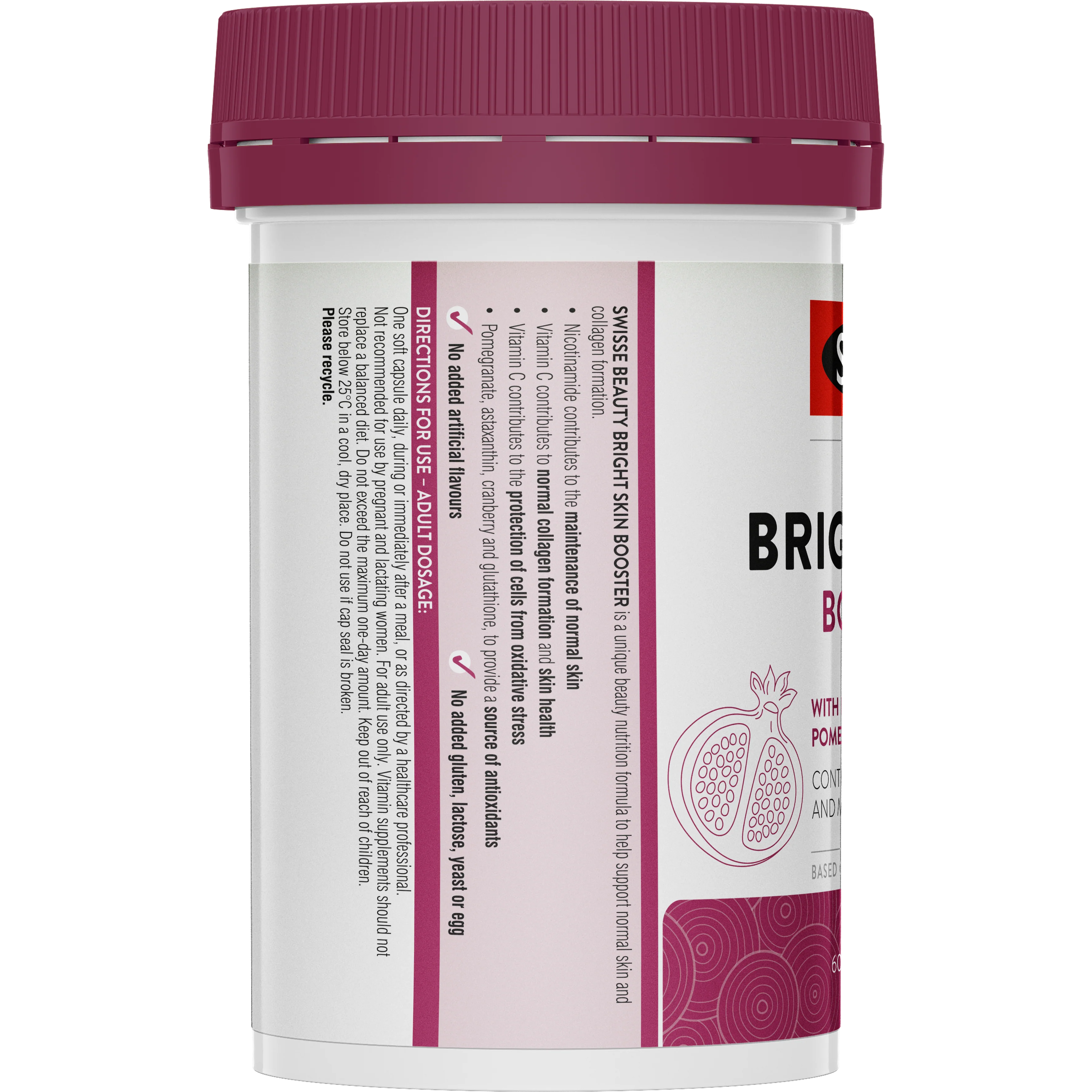 Imagine waking up every day to a complexion that's luminous and glowing, thanks to Swisse Beauty Bright Skin Booster. Our premium quality formula combines the benefits of vitamin C, astaxanthin, glutathione, and a blend of cranberry, pomegranate, and briar rose. Vitamin C supports collagen formation and maintenance of healthy skin.